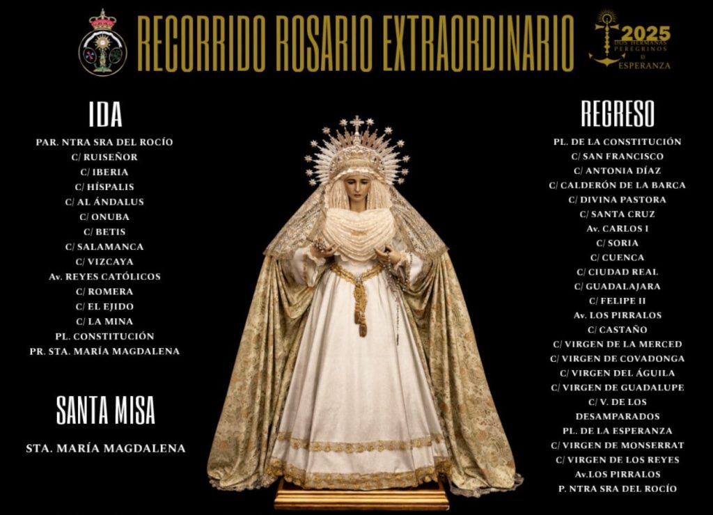 Como ya hemos anunciado anteriormente, Maria Santísima de la Esperanza saldrá el próximo sábado 11 de octubre a las 8:00h. en Rosario de la Aurora hacia la Parroquia de Santa María Magdalena llegando a las 10:30h.